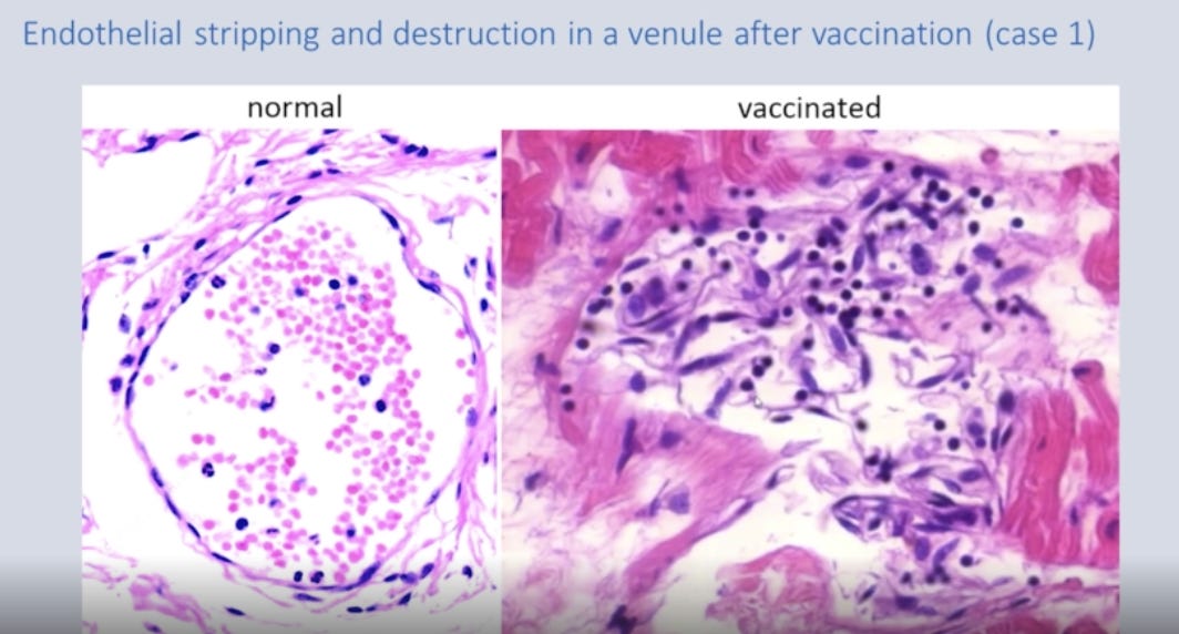 Now, lets get to the point of this post. Fortunately, there have been a couple of renegade pathologists who appropriately investigated the unexpected deaths to try to identify whether the vaccine caused it. The most public were Drs. Arne Burkhart and Sucharit Bhakti from Germany and Dr. Ryan Cole here in the U.S. Despite Dr. Bakhti being retired, he was one of the most outspoken and has endured numerous attacks as a result (don’t read his Wikipedia page). Dr. Cole has unsurprisingly endured numerous attacks against his license and his business (insurance plans dropped him which forced him to sell his practice). Dr. Burkhart is now dead. He apparently died while swimming in a lake. No further comment.