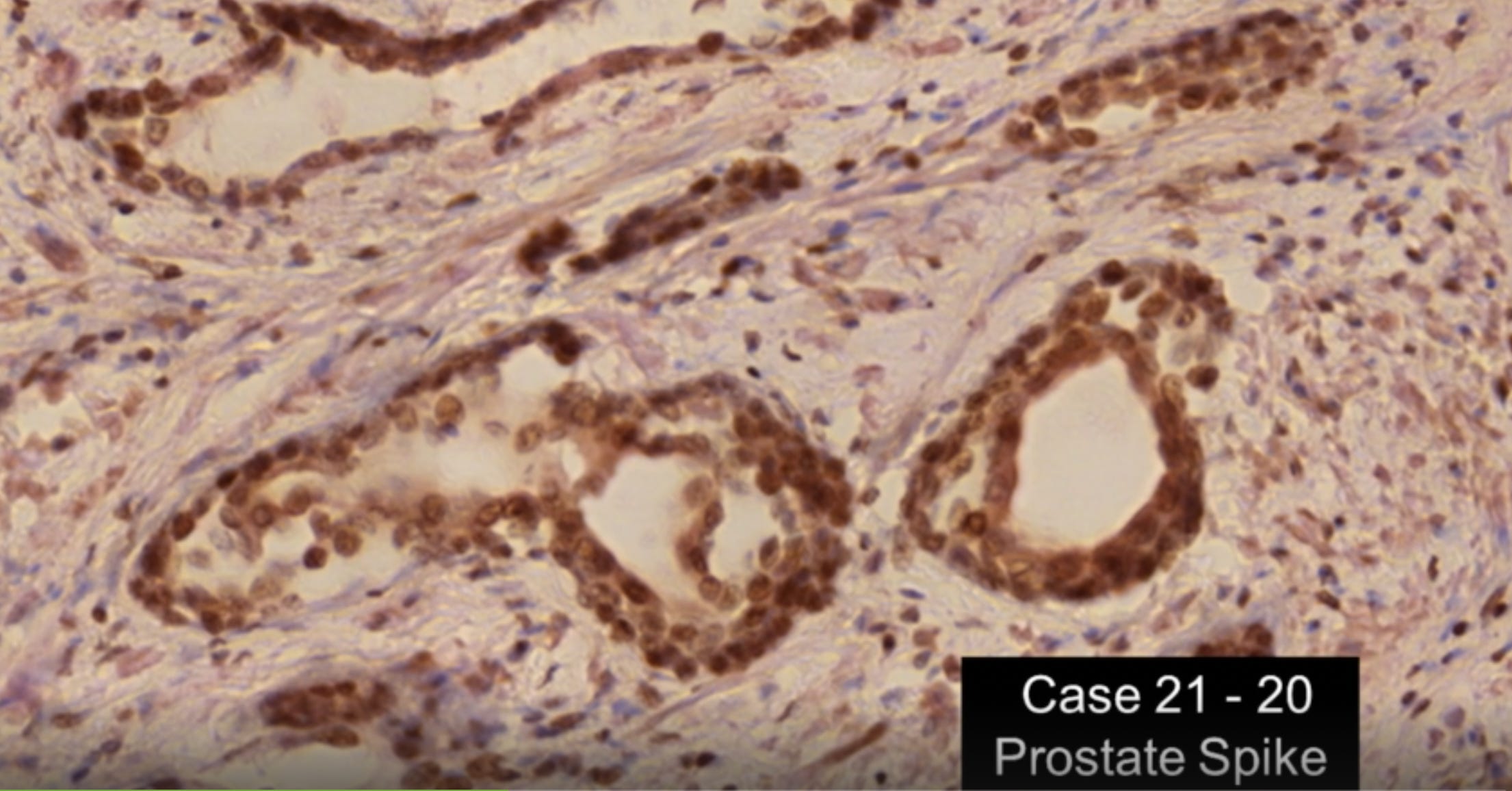 Below is tissue from the prostate of a man who died from the vaccine. The round, clear areas are tiny glands in the prostate. The glands are literally circled and/or filled with brown stained spike protein. Note this is in the prostate. Not in the arm.