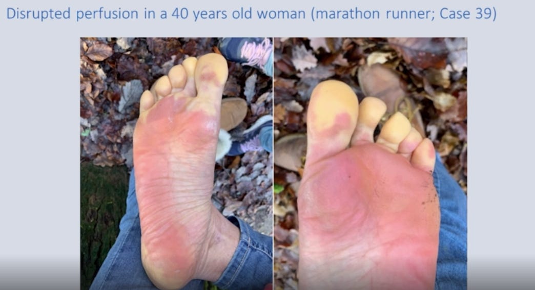 He also performed biopsies of four live patients, one of whom was a former marathon runner who developed severe circulatory problems after the vaccine. Look at the patchy white areas of her feet which represent areas of poor to no blood flow that results from vessel occlusion and destruction as above. Apparently her feet become so painful she often cannot walk.