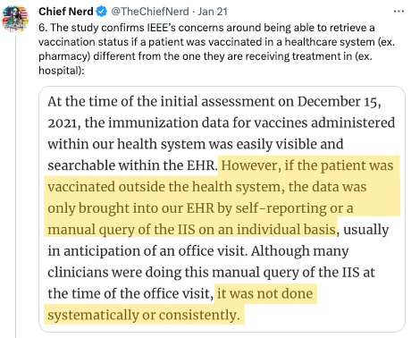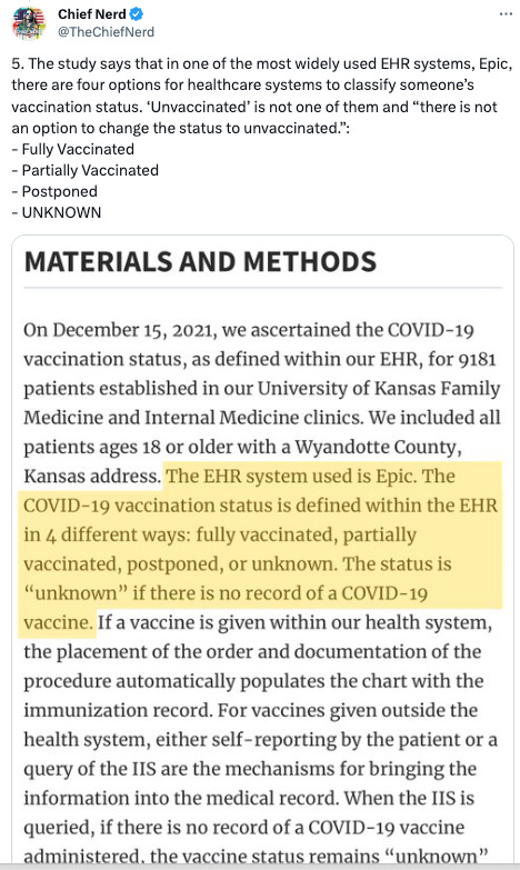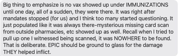 In the other, larger, major (and I mean major) health system she worked in which used EPIC, if the patient received the vaccine from anywhere but an employed provider’s clinic within the health system (even if the patient had a vaccine card on them), she was forced to put it in an “open field” buried on page 2 of the initial nursing assessment where nobody, and certainly no physician looked for it. All these patients were automatically documented on the main screen as “Unknown”, i.e “Unvaccinated”, even if the dates of each shot were entered into that nursing note field.