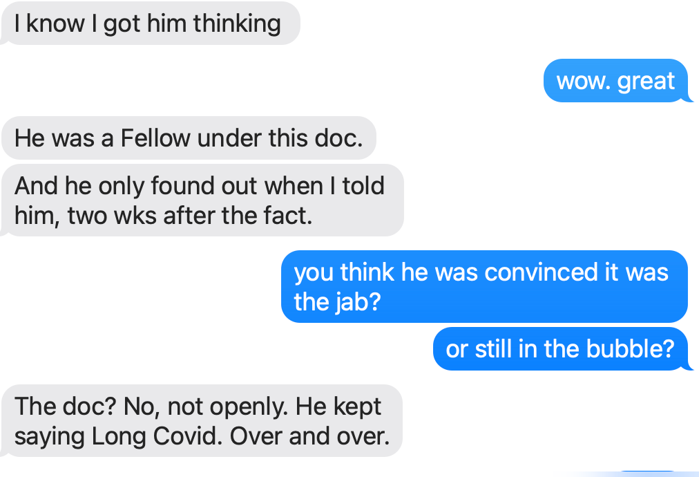 I am on a group text chat with my closest Long Vax/Long Covid treatment docs. One colleague just texted this to the group the other night: