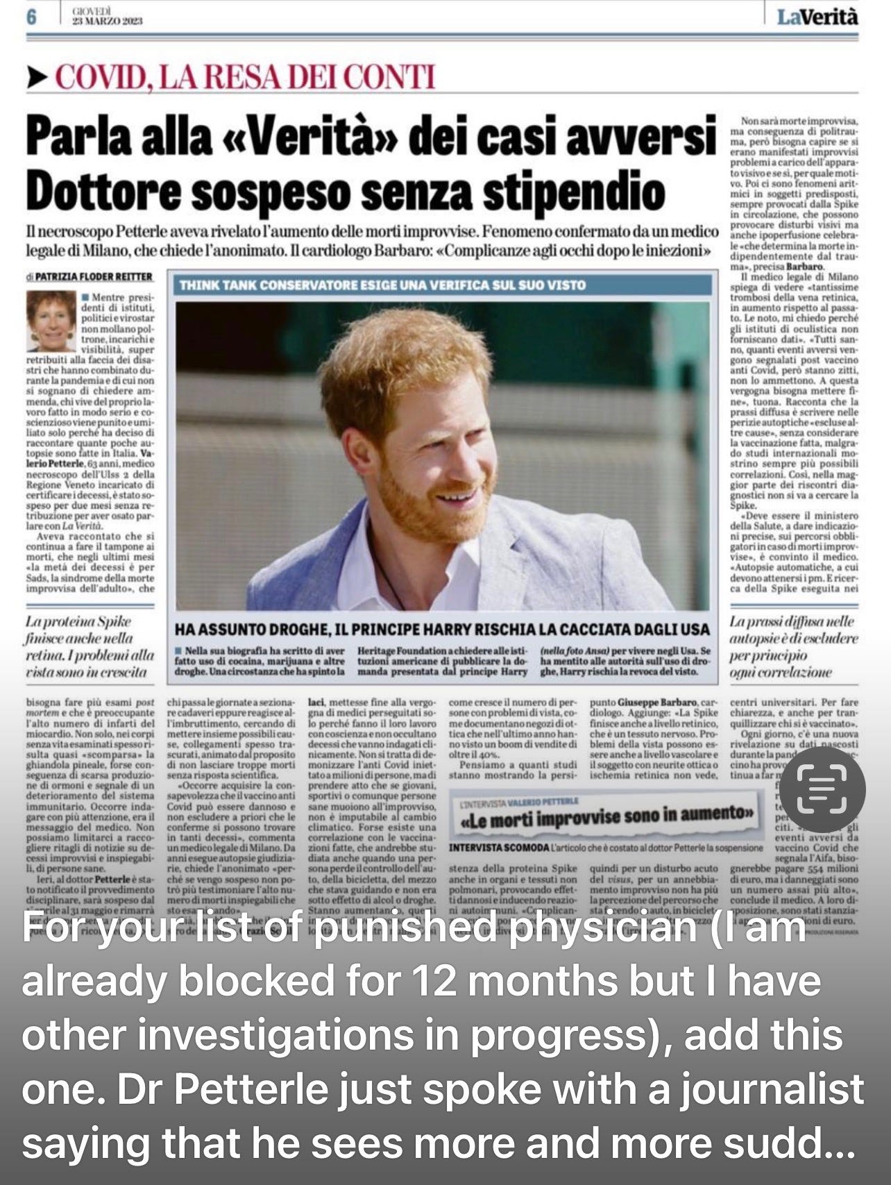My Italian early treatment colleague, Dr. Andrea Stromezzi, sent me this below article about a pathologist friend of his who dared to publicly comment on the sudden rise in autopsies of young people that had suffered a sudden death. His reward? Suspended for two months without pay as per this headline in Italian (can go here and use Google translate if you want to read the article in English):