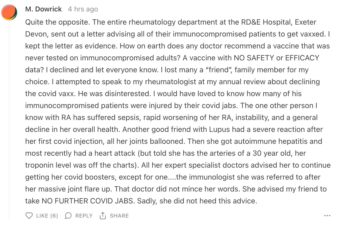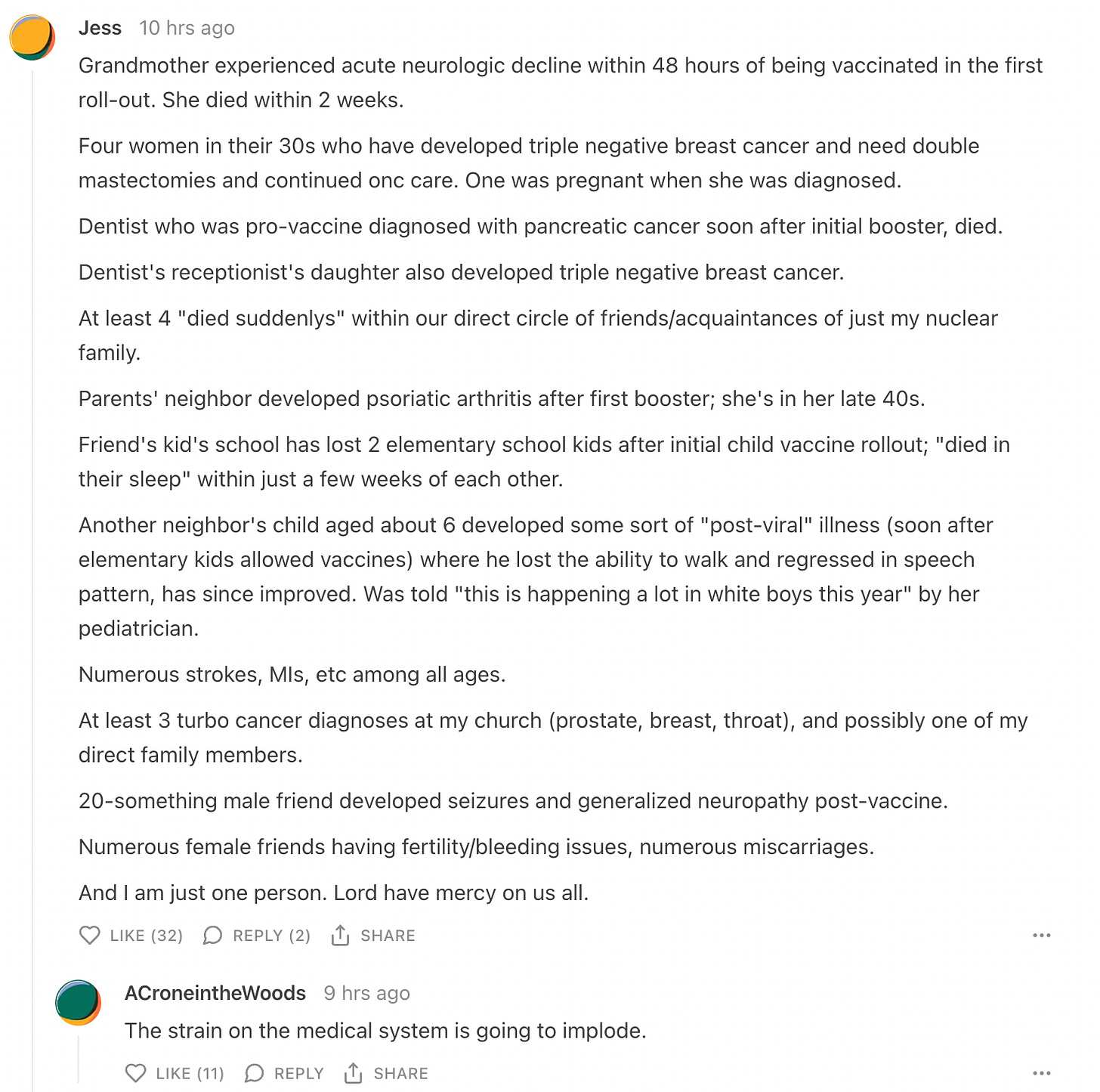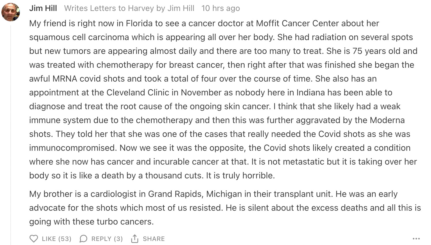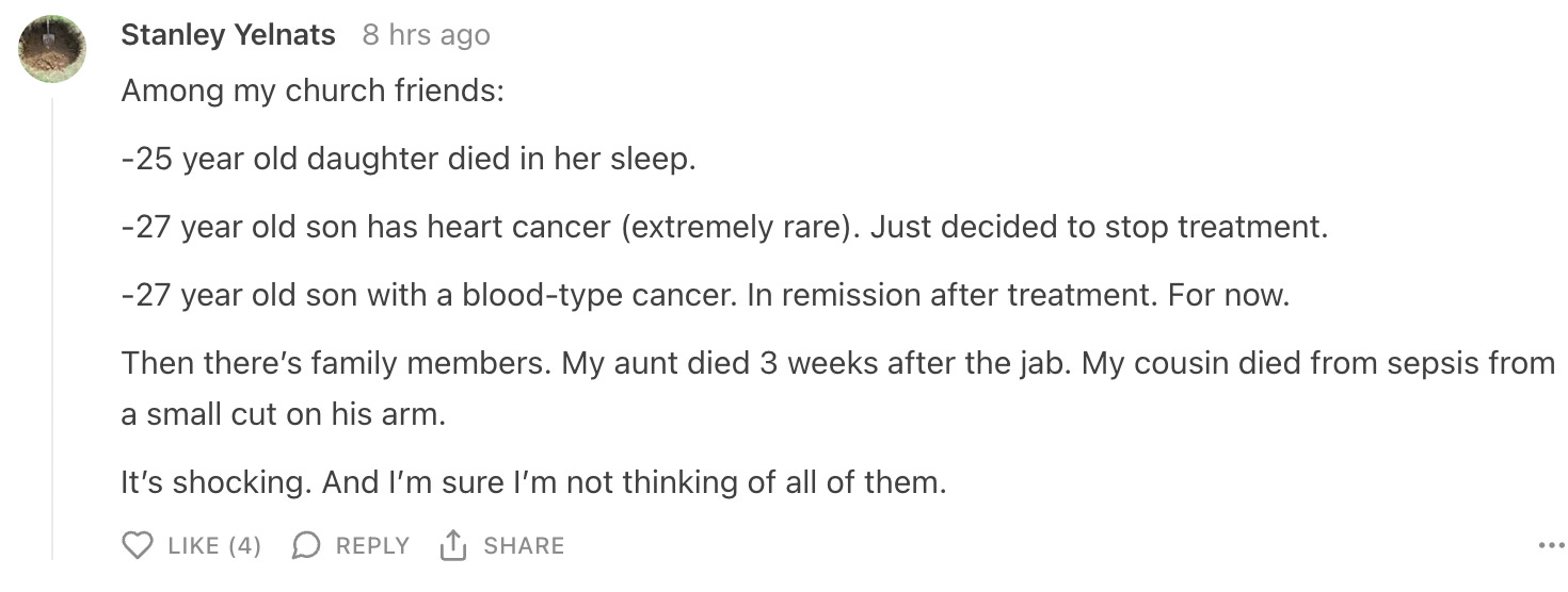 One of the docs I know died on his way in to clinic. He had been boosted at urging of colleagues, though had a bad time w original injections. Had MI mid last yr, out for months. Came back, had what he considered long Covid sx, not vax injury. Refused to believe in it. In and out on leave and finally back on full schedule, but could not shake “it” with symptoms still present. Then came the nudge to get boosted. Sent him spiraling again. Out for awhile again. Coming back to clinic and died on his way in.. autopsy done. And you can guess what was found from heart tissue then.