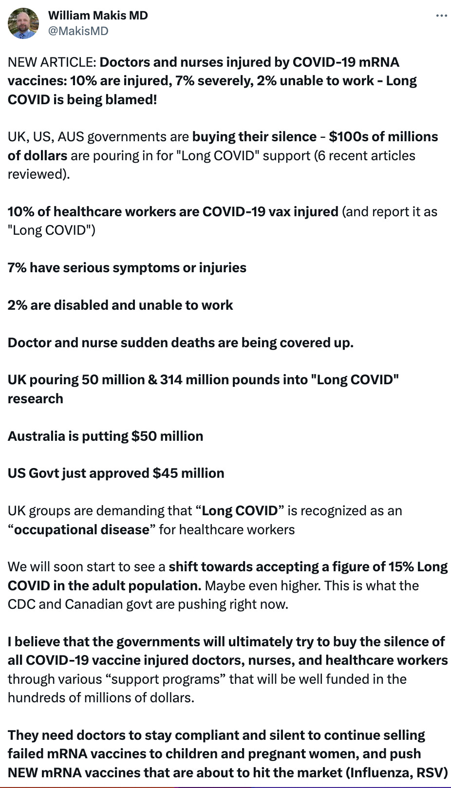 Long Vax is clearly becoming a major problem for the healthcare workforce. Except it is instead systematically attributed to Long Covid instead. Either way, numerous countries (UK, USA, Australia) are starting to commit many tens of millions of dollars to address this disability epidemic.