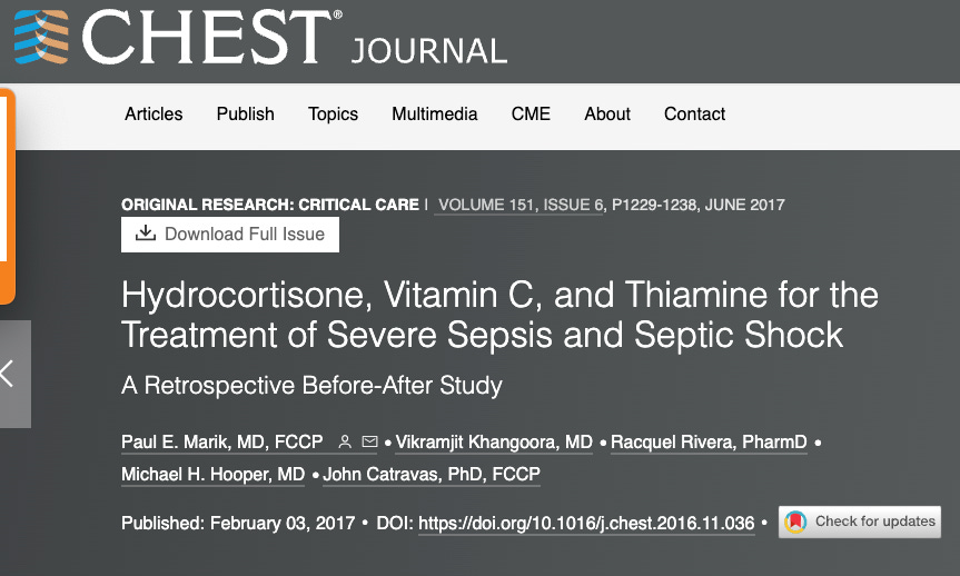 Note that the FLCCC doctors are all experts in sepsis and septic shock. Our late-career shared-research-interest and practice was in the use of high-dose intravenous Vitamin C to treat the condition. Our interest started with my friend, colleague, menotr, and co-founderProfessor Paul Marik’s 2017 landmark study and protocol eventually called mHAT (melatonin, IV hydrocortisone, IV ascorbic acid (Vitamin C), and IV thiamine). If interested, I gave a brief lecture on sepsis and the efficacy of Paul’s protocol on a recent FLCCC webinar. This was Paul’s landmark paper: