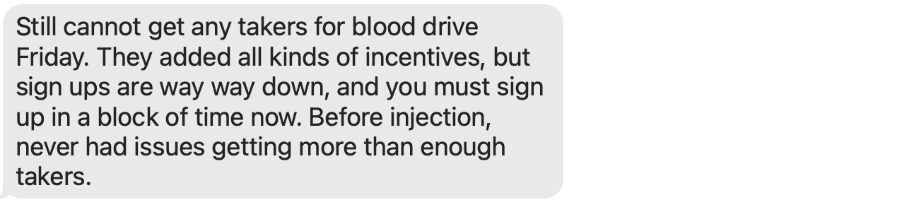 Last of my series of posts (for now) on reports from the front lines. Currently, am hearing of issues with blood donor drives, vaccine exemptions, hiding of vax status, and cognitive dissonance.