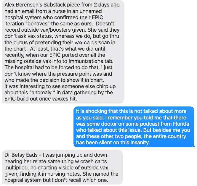 This is one of the most important points telling of the fraud: in EPIC, there were only two vaccination categories possible: “Vaccinated” or “Unknown.” In the almost entire year of 2021 that I worked in ICU;s, I only took care of one patient who had a “Vaccinated “status in their chart, the rest had an “Unknown” vaccination status. I firmly believe that these “unknown” patients were all categorized as “unvaccinated” in public health agency analyses.