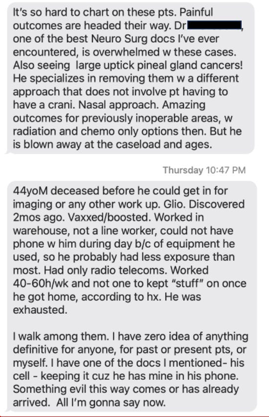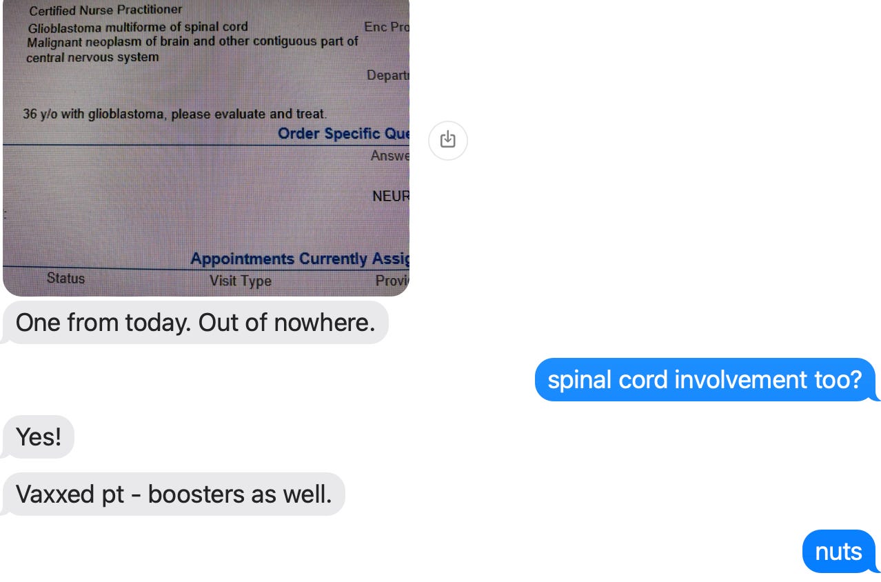 It’s unbelievable how many charts I see in a week. Hundreds at a time. Pts seen and discussion with them yields even more info than charted if you ask the right questions. But the charting is trending to more inclusion of injection as relevant to current status. Don’t ask me how that changed, but I’d say that deaths of colleagues and let’s say proximity to vax/boosters factored in, if anyone reads real data that is out for everyone to absorb. I’m just in one system but it’s HUGE, so it’s not a tiny tertiary system I can sample from - so many services and cross-services linking now. The notes I read astonish me, b/c a yr ago, I’d never read what I’m reading in charts now.
