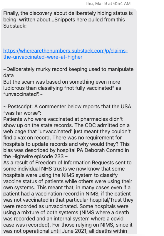 This conclusion was not supported by data from any other country that transparently shared the hospitalization n rates of outcomes of vaxxed vs. unvaxxed. Another telling feature of those countries (UK, Scotland, Australia etc) is that at some point subsequently, all publicly declared that they would no longer be sharing the vaccination status within their morbidity reports “for fear of the data being mis-interpreted.” At least that is how I understood their posted explanations.