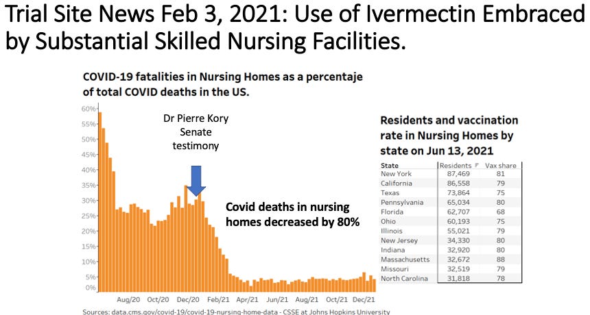 From the above, it should be noted that prior to our FLCCC ivermectin paper being posted on a pre-print server (Nov 13, 2020) and prior to my testimony in the Senate hearings of Senator Ron Johnson noted above (Dec. 8, 2020), nursing home residents made up about 30% of all COVID deaths in the U.S. (also note that Senator Johnson’s efforts have made him one of the most (if not the most) impactful of the early treatment advocates for COVID in this country.. (and in history?).