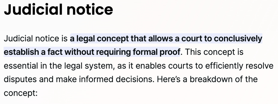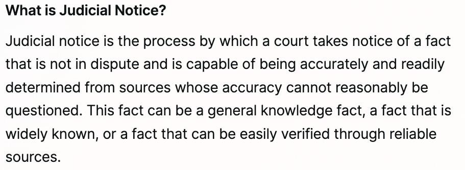 Wait, what? “Judicial notice?” “Truth of facts?” Let me explain (from Brave browser AI):