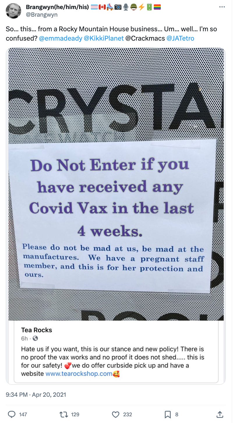 This shop owner felt strongly that shedding was such a risk and a reality that they put up a sign on their front door asking that customers who had been vaccinated in the previous four weeks not enter the store.