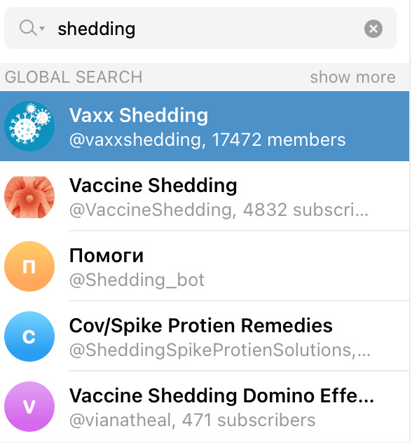 I searched “shedding” on Telegram and it came back with these groups, note one has over 17,000 members: