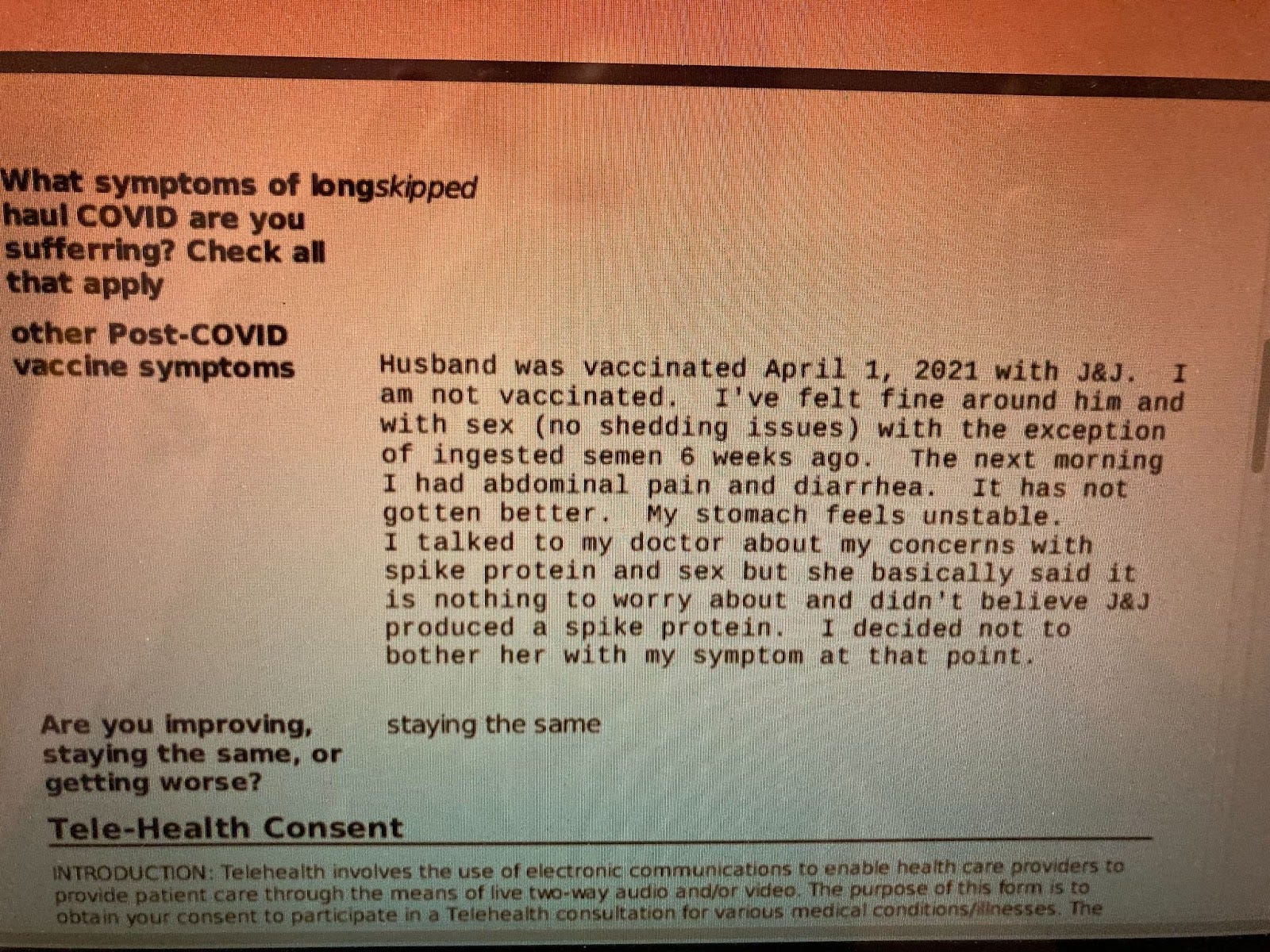 I find the near identical reports of acute illness developing after swallowing semen of a vaccinated man to be compelling evidence that spike protein or other mRNA vaccine components are present to a clinically impactful degree in sperm. Recall that shedding via sperm was not studied (as it should have been) in either animals or humans. Also know that both couples no longer engage in this type of intercourse.