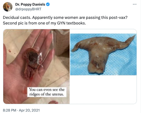 The fact that she suffered decidual cast shedding is particularly damning as this was an extremely rare condition prior to the Covid mRNA campaign (i.e. since the second half of the 20th century, there have only been around 50 published cases of decidual casting). Jim Thorpe, the OB-Gyn expert in maternal fetal medicine has apparently observed a huge “spike” in reports of decidual cast shedding since the mRNA campaign. This is probably a good time to tell you what a decidual cast is - it is when the entire lining of the uterus is expelled via the vagina en masse such that it looks like a “cast” of the uterus. See below: