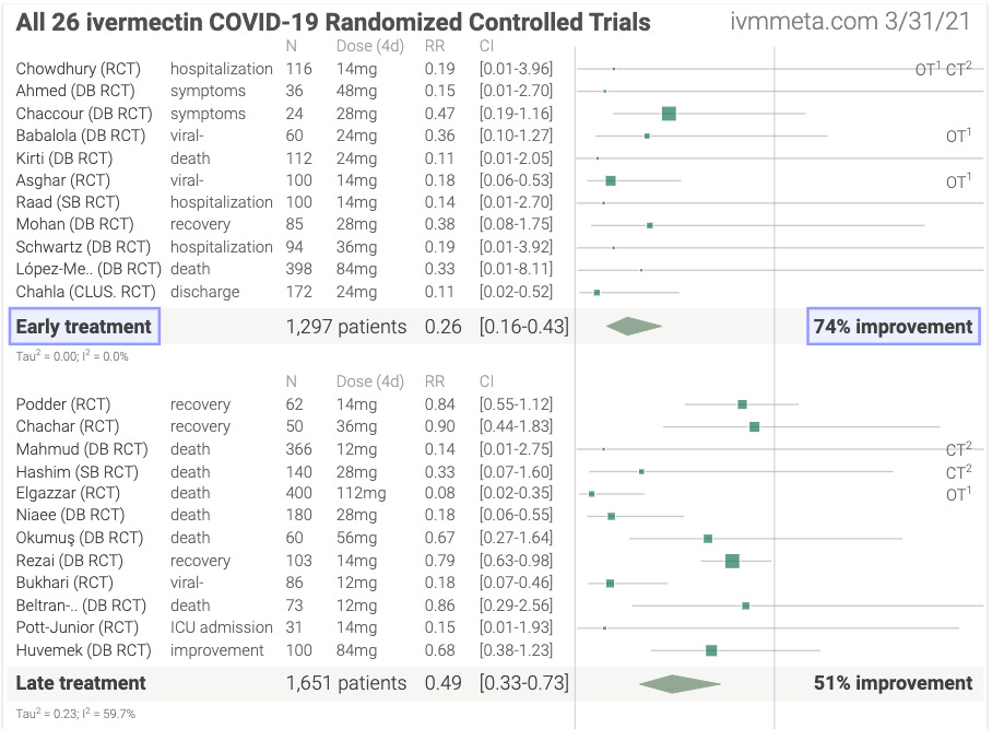 The main tactic that agencies and “experts” like Dr. Corneil use to reject extensive evidence in favor of the use of ivermectin in Covid-19 is to isolate a few negative studies and attempt to highlight them without acknowledging the substantial body of trials contributing data for a substantial meta-analysis.