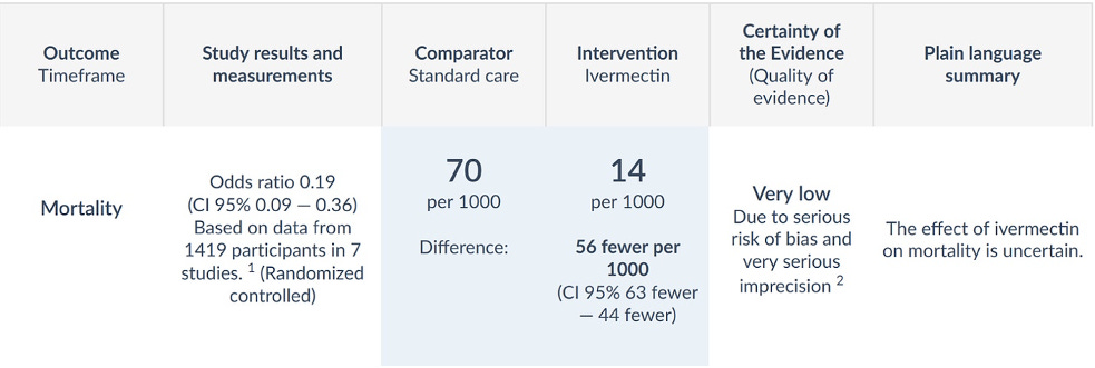 Note that from the six studies they included, the WHO found that there were 70 deaths per 1000 in the standard-of-care treated patients versus 14 deaths per 1000 in ivermectin treated patients, leading to a statistically significant 81% reduction in mortality. The chart below is from the WHO guideline document: