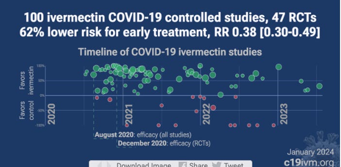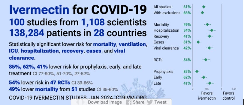 Based on my intensive study of the ivermectin evidence base, including in-vitro, in-vivo, clinical and epidemiological studies, the evidence for efficacy is overwhelming, with, as of today, January 10, 2023, results available from 100 controlled clinical trials, 47 of them randomized, with meta-analysis data finding statistically significant, large magnitude reductions in mortality, hospitalization, time to clinical recovery, and time to viral clearance.