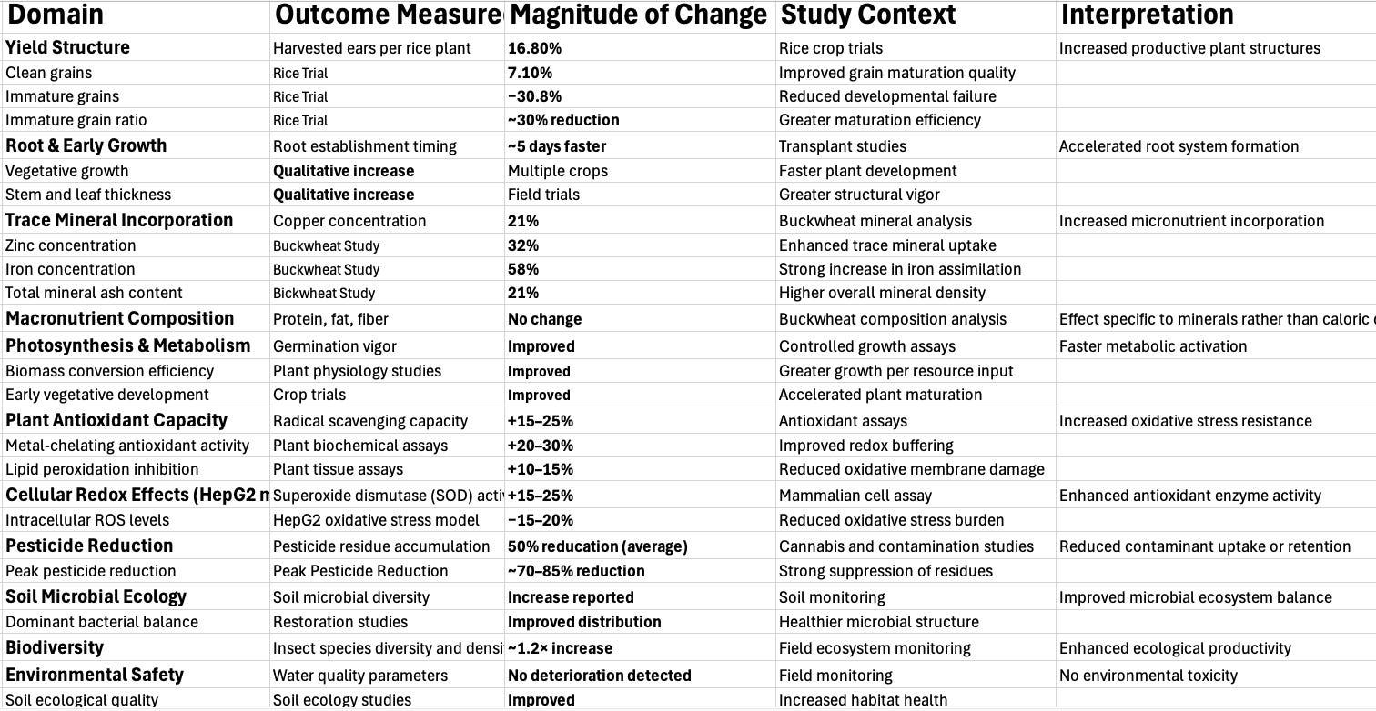 The collective evidence indicates that mineral-spectrum conditioning of irrigation or foliar environments may influence plant systems upstream of conventional nutrient supplementation, producing coordinated improvements in: