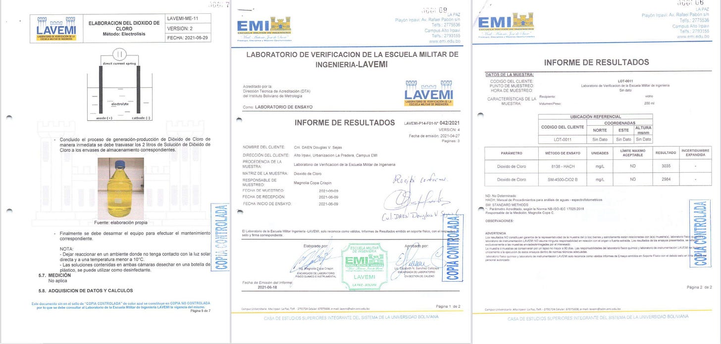 That is, until the revolutionary passing of a law in Bolivia in 2020, allowing for the widespread manufacture and distribution of oral chlorine dioxide solution to treat Covid. In my first post on chlorine dioxide, I provided an enormous amount of documentation that Bolivian military forces and universities, right after the law was passed, began manufacturing and distributing it to Bolivians. This program led to Bolivia having the best outcomes in all of South America despite the strenuous objections in media interviews and press releases by their health ministry). Power to the people.