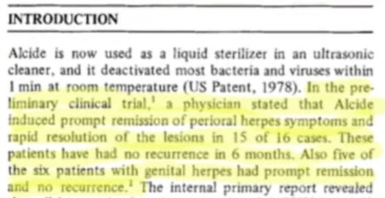 “Alcide (a patented form of chlorine dioxide) induced prompt remission of peri-oral herpes symptoms and rapid resolution of the lesions in 15 of 16 cases. These patients have had no recurrence in 6 months. Also five of the six patients with genital herpes had prompt remission and no recurrence." Reference: A. R. Shalita, Internal report from Department of Medicine, Division of Dermatology, Downstate Medical Center, State University of New York, May 1, 1979.)
