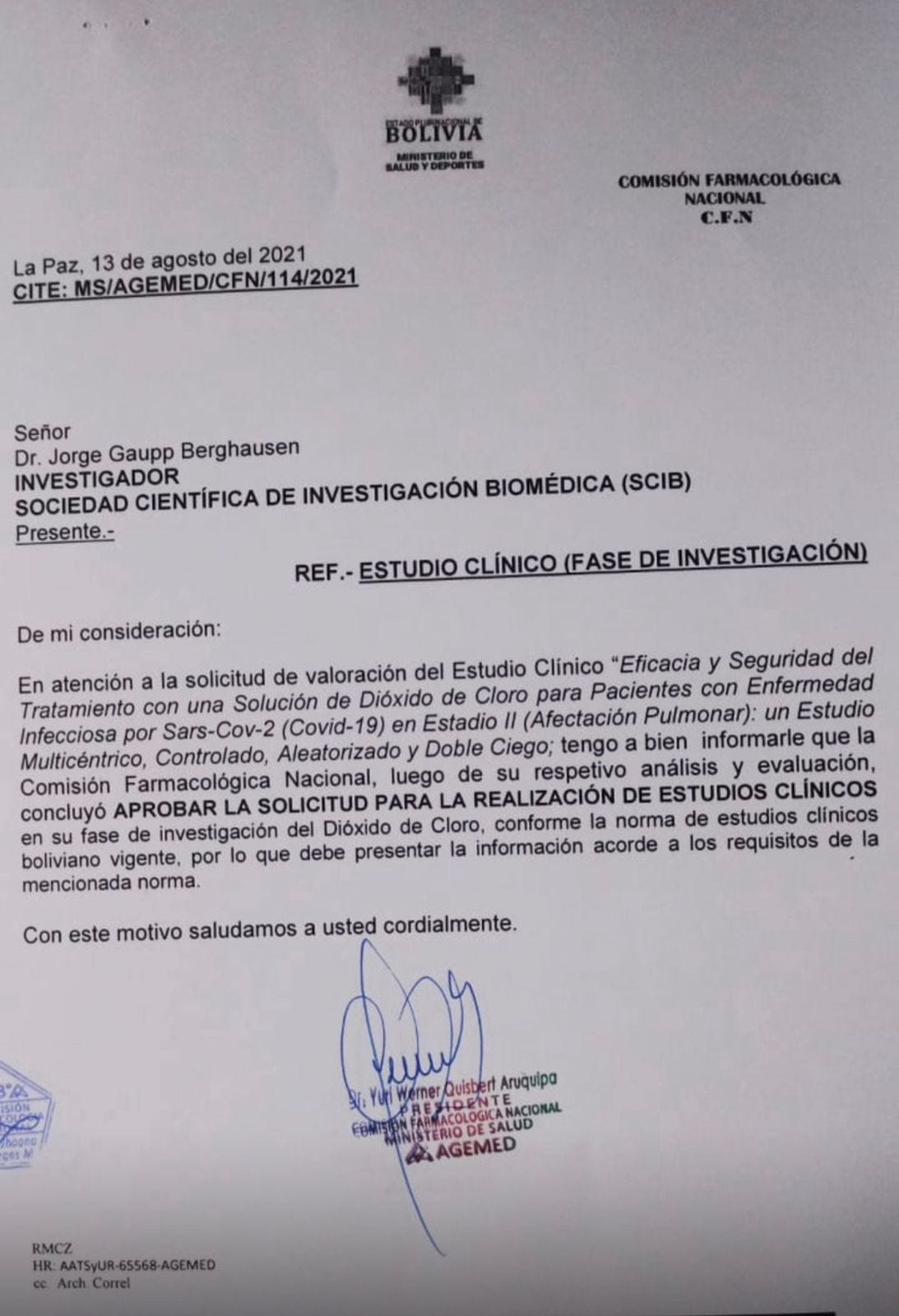 In response to the request for the evaluation of the efficacy and safety of a clinical study involving a chlorine dioxide solution as a treatment for patients with SARS-CoV-2 infectious disease (COVID-19), Phase 1, a multicenter, randomized, controlled, double-blind study, I am pleased to inform you that the National Pharmacological Commission, after its respective analysis and evaluation, has concluded to approve the request to conduct the clinical study in its research phase with chlorine dioxide, in accordance with the current Bolivian clinical study regulations.