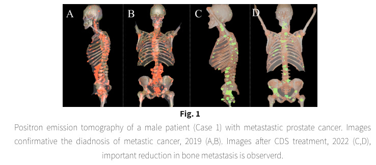 Patient 3: 73 y.o woman with metastatic non-Hodgkins lymphoma received 8 sessions of chemotherapy with significant side effects. New bone mets were then noted and she refused any further chemo or radiation that was being offerred. She then started on an oral chlorine dioxide protocol combined with oral DMSO but low back pain continued. She then added an enema protocol along with 18-20 hour fasting windows on a daily basis. At 38 months from diagnosis, a significant reduction of the tumors in the invaded tissues was observed without new metastases.