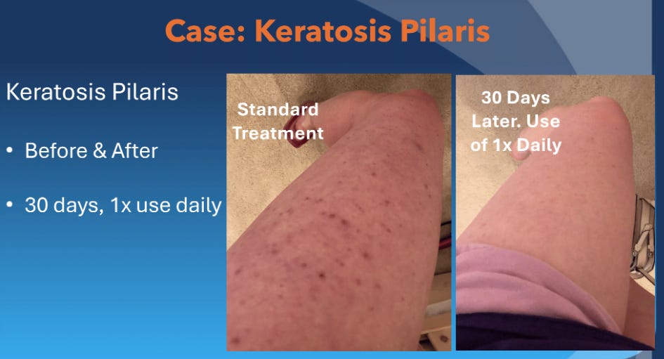 KP is a skin condition that results from a buildup of keratin, a hair protein, in the pores. This blocks hair follicles, forming small bumps over where hair should grow. Nothing works very well, given that existing therapies are either too irritating, too expensive, take too long or are too difficult to comply with as they smell or feel weird. In this case series, they reported: