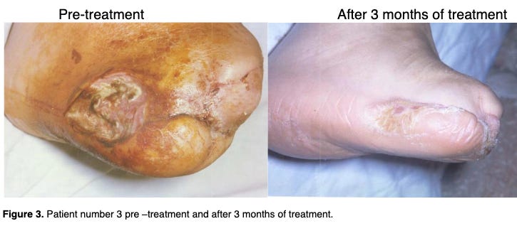 In this case series, 12 patients with severe ulcers complicated by gangrenous toes and osteomyelitis were treated with WF10. Eight had been referred for below the knee amputation. None of the individuals ended up requiring amputation. 8 of the 12 patients achieved “complete healing” and 3 more achieved “significant improvement.”
