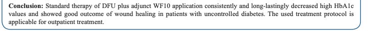 In this prospective, interventional, pretest-posttest study, 40 DFU patients with HbA1c > 8.5 % were treated with standard therapy plus five weekly infusions of the chlorite-based drug WF10. In 38 treated patients WF10 decreased the HbA1c value from 10.48 at baseline to 8.06 at Week 8 and the Wound Severity Score went from 8.0 to 1.4 (both p < 0.0001) at Week 12. No serious side effect of WF10 was observed.