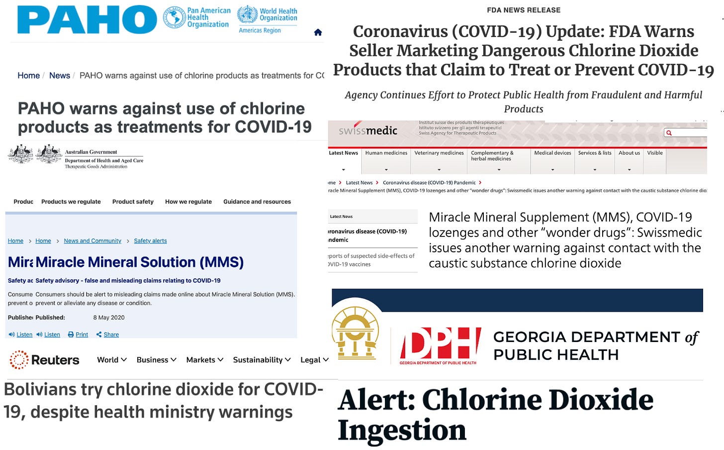 To wit, when the topic of oral ingestion of chlorine dioxide is addressed, numerous copycat bulletins are posted by regulatory agencies such as the FDA, TGA, , PAHO/WHO, SWISSMEDIC and other health authorities that advise against its use by falsely alleging that it is toxic and/or dangerous to ingest, describing it as "bleach," "bleach-like," or a "poison." See examples of the coordinated fear-mongering: