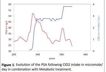 Patient 2: 67 year old man with Gleason 8, hormone resistant metastatic prostate cancer. Oral chlorine dioxide ingestion protocol led to a sharp decrease in his PSA level as well as decreased pain and an increased Karnofsky performance score. Despite taking 8 times a day, some months later his metastatic pain, which had almost completely disappeared, returned and caused significant insomnia. He increased intake to every 90 minutes during the night in addition to his daytime dosing. Nightly metastatic pain decreased drastically from day one, and the second part of the night was practically pain free. The PSA decreased again linearly from 39 to 24. See below: