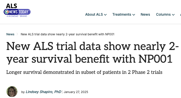 2024 - A retrospective observational controlled trial of 268 patients who had participated in the 1mg/kg or 2mg/kg treatment trials of NP001 and who had “received at least one dose,” something which is called an “intention to treat analyses.” Meaning, they did not just include patients who had completed the trials but the larger number who had simply started it. The median overall survival (OS) was 4.8 months longer in the treated group. Among patients aged ≤ 65 years, the median OS for the 2 mg/kg NP001 group was 3.3 years vs. 2.4 years in the placebo group). No differences were observed in the 1 mg/kg NP001 group or in patients aged > 65 years. So at higher doses and in younger patients, they survived a year longer. In ALS? Wow.