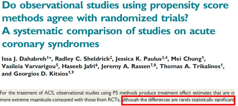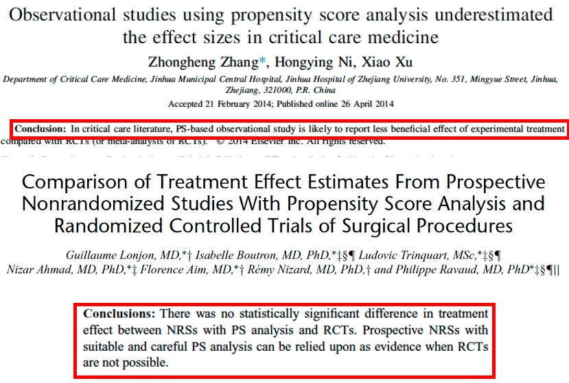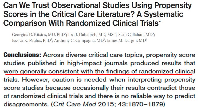 i. A major reason why the exclusion of observational trials data is so damaging to science, is that well-meaning and committed clinicians and researchers (describes the majority of investigators that conducted Ivermectin trials in COVID) can do small “single-center” (a four letter word in academia) RCT’s or OCT’s easily and at low cost since OCT’s can be done via chart review comparing those who were treated with a medicine with those who were not. Many use a technique called “propensity score matching” to balance the comparison groups to approximate an RCT, and actually almost always reach the same conclusions and magnitude of effect as RCT’s. See below snapshots of slides from a talk I used to give when I was teaching (I mean, allowed to teach).