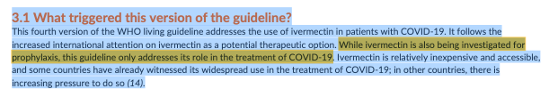 1) His project scope specifically excluded looking at the RCT’s of ivermectin used in prevention. I cannot over-emphasize the catastrophic impacts of this. See below comment from the WHO guideline document and from the NIH document. They specifically avoid looking at ivermectin’s role in prevention despite at the time having results from 3 extremely well-done RCT’s with large magnitude benefits.. and this was before the massive Itajai study finding profound benefits when used as a preventive (which the agencies are nicely ignoring). Does it lie within the realm of possibilities that the reason may have been they were concerned about increasing vaccine hesitancy by identifying a super-safe, low cost, widely available alternative in prevention of COVID? Look at this crap from page 7 of the WHO guideline document from March 31st, 2021