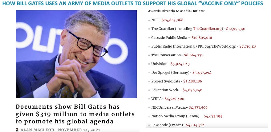 Note this was the “old” Cochrane Library, you know, the one before BMGF started giving it massive money, i.e. the “new” Cochrane library instead published an essentially fraudulent meta-analysis of just the RCT trials of ivermectin, using similar tactics to the WHO guideline (which I will get to very soon in Post 3 of this “series”) whereby they cherry-picked just 14 of the then available 24 RCT’s so as to find a supposedly “uncertain” efficacy. By the way, thinking about it a little more, can anyone explain to me why BMGF, purportedly an organization focused on public health and vaccinating the world.. gives so much money to major media organizations and to medical journals? Below slide from a recent lecture of mine.. contains just a handful of the media outlets getting money from him.