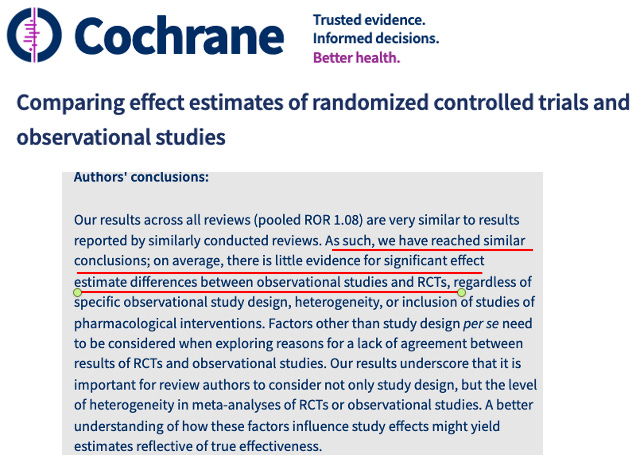 a. OCT’s and RCT’s, on average, over decades.. reach the same results – see this massive review comparing results from OCT’s and RCT’s from the Cochrane Library from a few years ago.