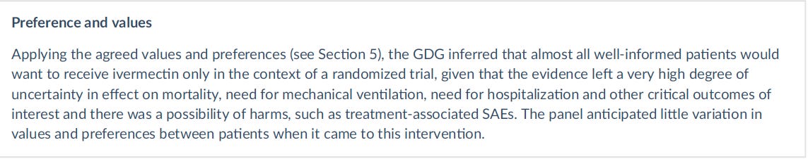 So, what they are saying in the above superficially erudite, albeit sociopathic paragraph is that, in the WHO Guideline Committee’s opinion, based on some Pharma-conflicted academic blowhard’s opinion that the evidence showing an 80% lower risk of dying was of “low certainty,” the average human on Earth would prefer to not be treated with ivermectin “outside of a clinical trial.” I am again at a loss for words here. I didn’t know that the average breathless or dying COVID patient would so interested in supporting medical research with one of the safest medicines in history unless it was part of a Big-Pharma controlled clinical trial. What an unconscionably depraved opinion.