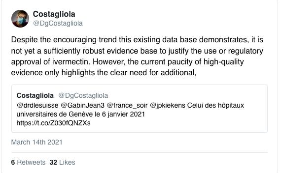Again, no clinician or researcher thinks about regulatory authorities, we just do research and publish it. Ok, so Andy let others influence the report of his findings. It was a paper on a preprint server and although it got global attention, it was a pre-print, not published in a high-impact journal etc. The call for waiting for “large, well conducted trials” is exactly how Pharma will put the genie back in the bottle. Pharma was already busy designing trials like the TOGETHER trial, demonstrably one of the most fraudulently conducted in history. Yet it still managed to get published in the top medical journal in the world. Science.