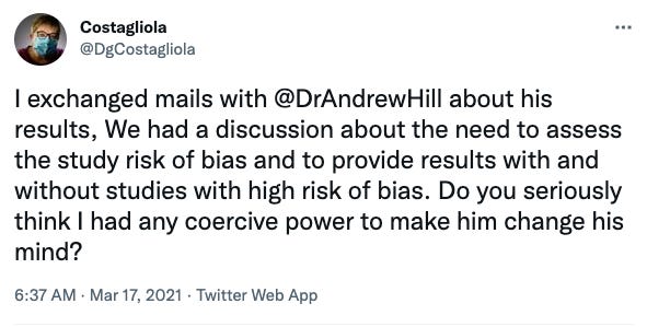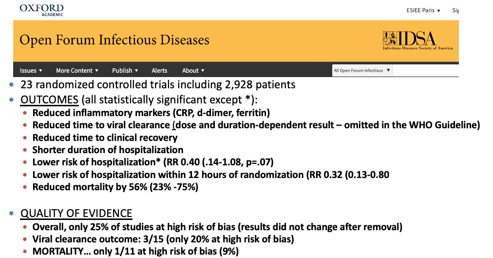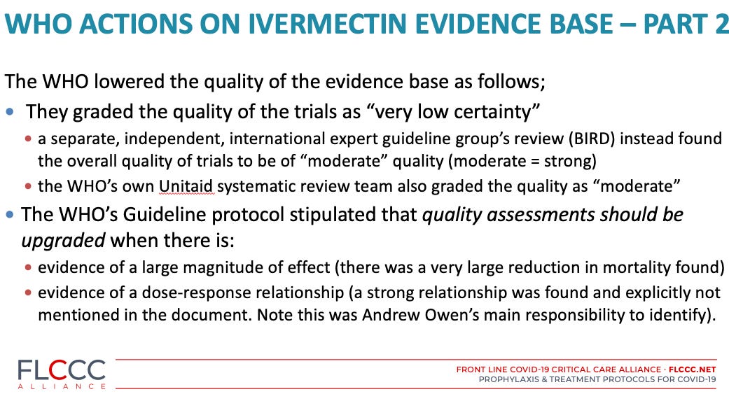 My paper extensively detailed how they whittled down the evidence base to as few trials as possible, using arbitrary exclusion criteria. Then they graded the few remaining trials that showed large, positive effects as “low quality” and a large Pharma conflicted trial that showed no benefit as “high quality.” What is fascinating is that despite the fact that even amongst the paucity of remaining trials left, a massive reduction in mortality was found. They found a life-saving medicine in COVID. Yet they stated that this conclusion was of such “low certainty” it should not be acted on. Science baby. Disgusting.