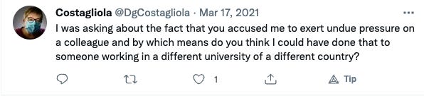 One still public tweet includes about the dumbest public defense imaginable on whether she had influenced Andy Hill’s paper. Check it out: