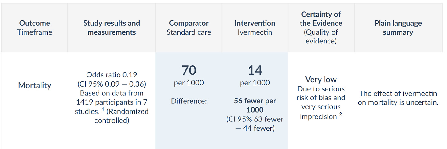 See below. Note they grade the evidence as having “very serious imprecision.” Without going too deep, downgrading the quality of the evidence to the degree they did based on imprecision is simply wrong when the treatment effect is so large, the outcome prevented is death, and the medicine is one of the safest, least expensive, and most widely available in the world. Had I had a seat at the committee table I would have raged at this. But they don’t invite people like me onto captured regulatory agency committees. Because I don’t take Pharma money. Never have. Never will.