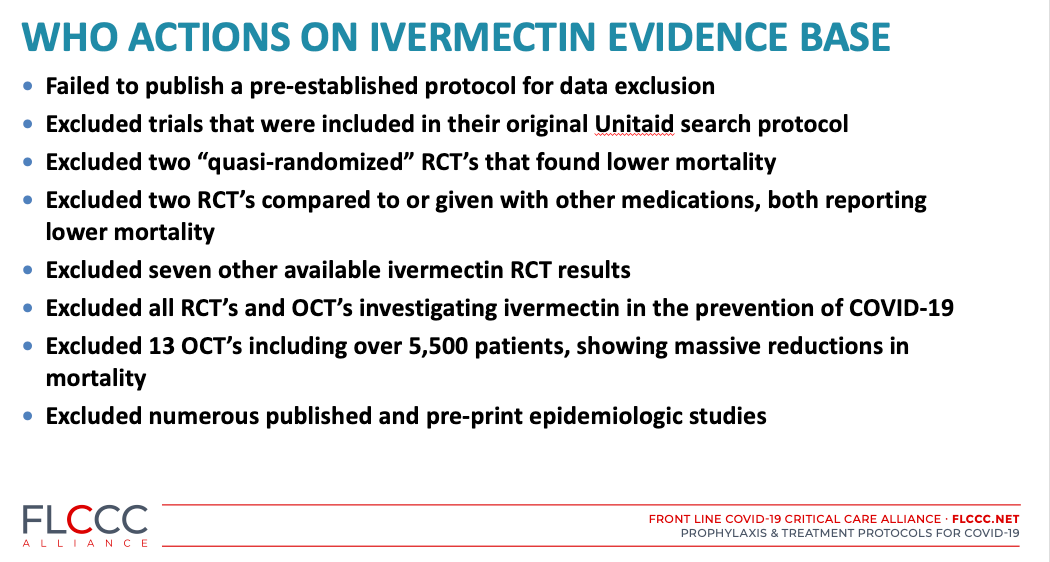 Had the WHO recommended ivermectin, even using one of the conditional or “weak” recommendations available to them, it would have changed history and saved millions of lives across the world. Physicians would have adopted it globally at a time when there was no “official” early treatment option for COVID outside about a dozen low and middle income countries that had adopted ivermectin into their national or regional guidelines. A weak recommendation would have changed history by mitigating the disastrous scale and trajectory of the pandemic. And it would have prevented us from being subjected to the subsequent holocaust unleashed by lethal vaccines.