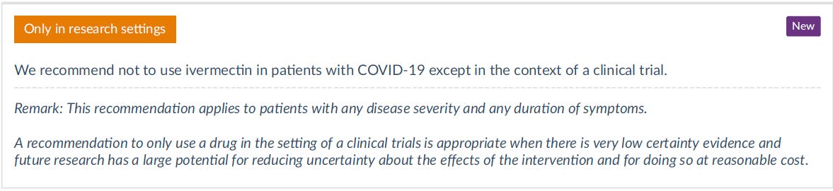 The most absurd statement in the recommendation was the one below. It was used to justify why they were recommending “against use outside of a clinical trial” despite finding a massive impact on mortality. Note how they even suggest there might be harms to using ivermectin, which is ludicrous and they knew it. I have never stopped being infuriated at whoever wrote these sentences: