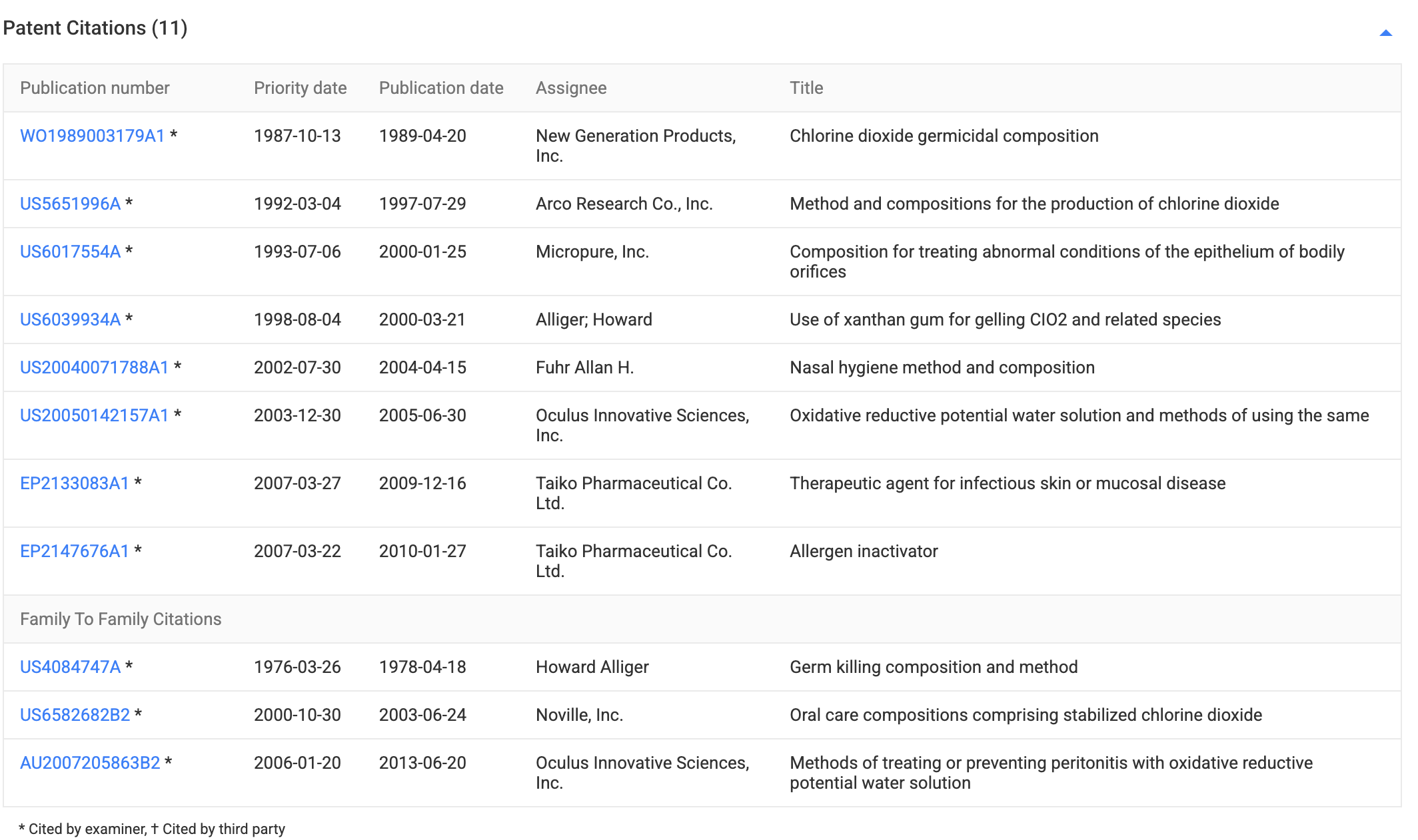 In his patent for treating sinusitis, numerous other chlorine dioxide patents by his and other companies for the treatment of various mucosal and skin conditions were cited: