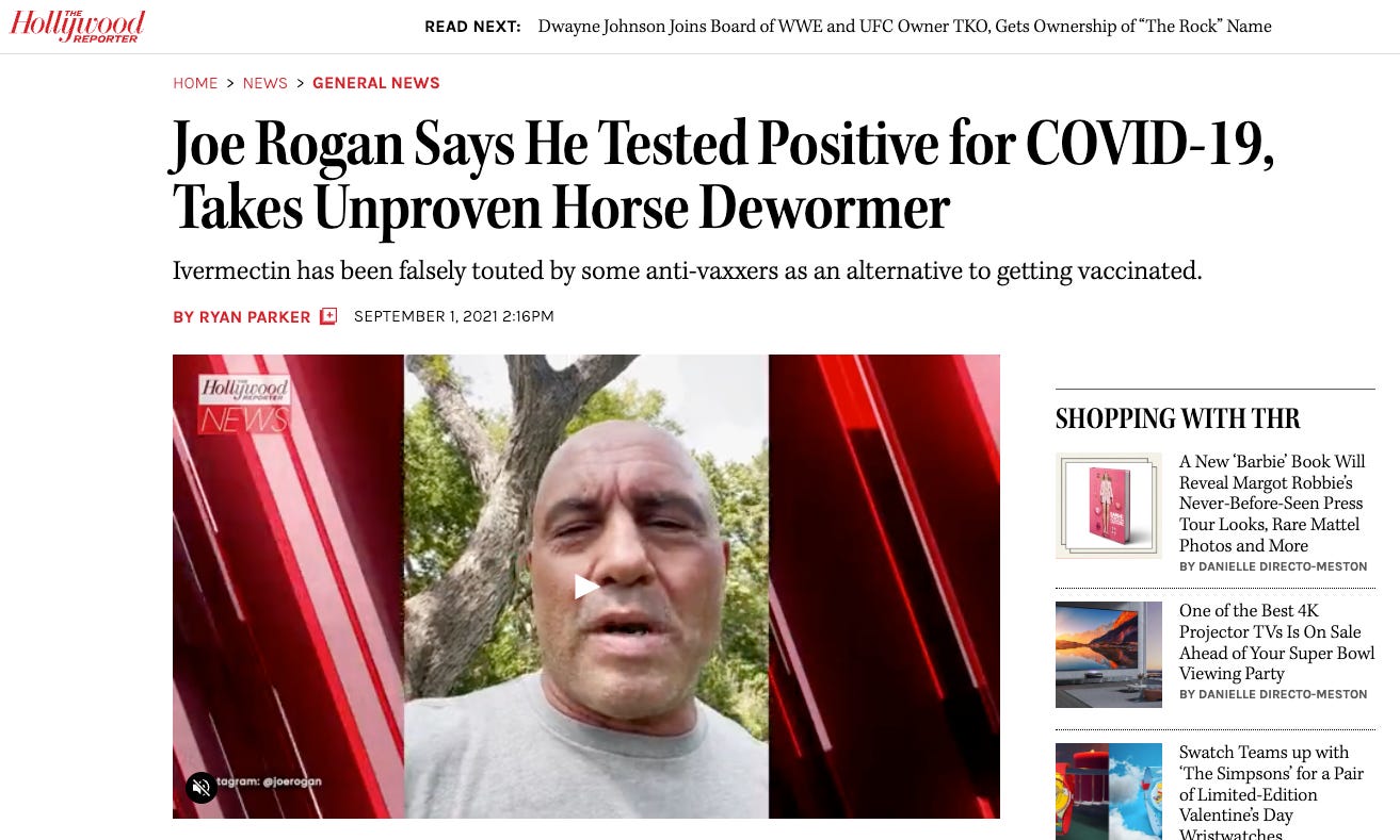 As you can see above, he then became the poster boy for the newly stoked anti-ivermectin mania. I love the phrase in the headline “unproven horse dewormer.” Redundancy has its strengths I suppose.