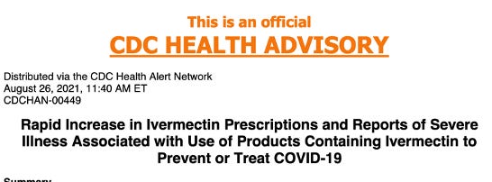 So after the FDA tweet went viral (largely because no-one had ever heard of a public health agency being snarky on Twitter before), the CDC jumped in five days later (Aug. 26, 2021) when they issued a bulletin to every State Health Department warning them of an alarming increase in overdoses and poisonings related to ivermectin. The 50 state Departments of Health then forwarded the bulletin to the inbox of every licensed doctor in the U.S within 24 hours: