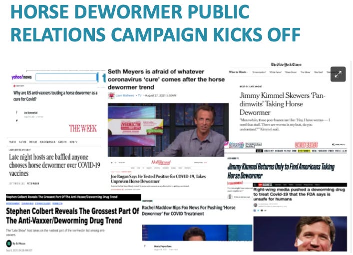 In my book The War on Ivermectin, Chapter 33 is titled “The Horse Dewormer PR Campaign.” In that chapter, I document the timeline and synchronized coordination between Federal public health agencies and corporate controlled media in their launch of a massive public relations campaign trying to get people and physicians to stop using ivermectin.