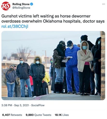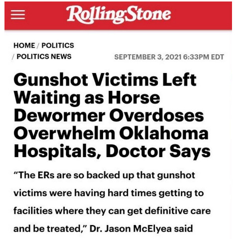 Although nothing about this is funny, but you do have to laugh at the absurd images that comes to my mind as I read that headline. I am forced to picture people waiting in lines holding their hands over a gushing belly shot, blood dripping on their shoes while ivermectin overdose patients are wheeled past them in gurneys. Too funny. But it gets even funnier. This is the picture that accompanied the Rolling Stones tweet about the article: