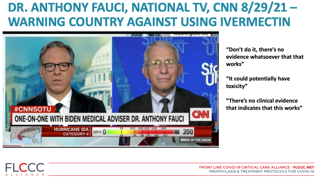 Although the CDC’s mendacity rivaled the FDA’s snarkiness, neither came close to what Fauci did next. Three days after the CDC memo, he was trotted out on national TV with CNN’s Jake Tapper to discuss the topic of ivermectin. Fauci had his talking points firmly committed to memory because, if you watch the interview here (44 seconds long), he rather clumsily says essentially the same “talking point” twice as below: